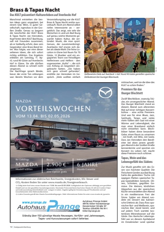 12 | Stadtgespr%u00e4ch Bad IburggnisaeL remusnoC rednatnaS red retneC-ecivreS menie %u2013 ecnaniF adzaM red )gnisaeL-retemoliK( tobegnA-gnisaeL-tavirP niE )1 nenie r%u00fcf %u2013 hcabdalgnehcn%u00f6M 16014 ,1 ztalP-rednatnaS ,)rebeggnisaeL( HbmG 5,2 | eniL-emirP 041 G vitcaykS-e 03-XC adzaM)SP 041( Wk 301 renizneB l ieb , 652 ,gnulhazrednoS-gnisaeL %u20ac 00,0 ,etargnisaeL rehciltanom %u20ac 84 dnu tiezfuaL netanoM 000.01 .lgzz ,rhaJ orp gnutsiefluaL mk 099 .lgzz dnu ,nedrew tenhceregba reldn%u00e4H sla snu nov eid ,netsoksgnurh%u00fcfreb%u00dc %u20ac nenoitkA/ness%u00e4lhcaN neredna tim thcin tsi dnu nednuktavirP r%u00fcf gitl%u00fcg tsi tobegnA .tztesegsuarov t%u00e4tinoB .netsoksgnussaluZ .rabreinibmok .eitnarag/ed.adzam.www retnu eiS nednfi nenoitamrofnI rheM .negnugnidebeitnaraG adzaM ned %u00df%u00e4meg eitnaraG erhaJ 6thcin dnis eguezrhaF netedlibegba red elamkremsgnuttatssuA eid ,ehieruaB negiliewej red neguezrhaF nov sotofleipsieB .setobegnA sed lietdnatseB NOV EIS NEREITIFORP NENOITIDNOK NEVITKARTTA dnu eigolonhceT ehcilttirhcstrof fua tffirt ngiseD-odoK seldE 03-XC adzaM netneizfife ned eiS nekcedtnE .nerotoM evitavonni tim 06-XC adzaM netnagele ned ,rotomsgeitsniE meuen tim tim 08-XC adzaM negimu%u00e4reg ned redo tsalegn%u00e4hnA t 5,2 uz sib .nenosreP 7 uz sib r%u00fcf nehierztiS 3 :treinibmok hcuarbreveigrenE 0,6 OC .mk 001/l 2 :treinibmok nenoissimE- 531 .mk/g OC 2 :essalK- D reuetS-ZFK ,netsokeigrenE ,etiewhcieR nehcsirtkele ruz nenoitamrofnI eretieW .OC dnu 2 .hcuarbreveigrenE/ed.adzam.www retnu eiS nednfi netsoK- ADZAM0 %u20ac gnulhaznA ba 03-XC adzaM652 %u20ac )1 nesael .ltm NEHCOW REVOSSORCSt%u00e4ndig %u00fcber 150 g%u00fcnstige Mazda Neuwagen, Vorf%u00fchr- und Jahreswagen, Tages- und Kurzzulassungen sofort lieferbar.MAZDAPREMIERENTAGEVOM 21.10. BIS 09.11.2024www.prange.de Autohaus Prange GmbH49176 Hilter-HankenbergeOsnabr%u00fccker Stra%u00dfe 57Telefon (05409) 94 91-1hilter@prange.deWir bieten Ihnen viele attraktive Angebote mit hohen Preisvorteilen aller Modelle, auch mitTageszulassungen oder als Vorf%u00fchrwagen.Seit fast 40 Jahren Ihr kompetenter Mazda-Vertragsh%u00e4ndler und -Servicepartner f%u00fcr dieseRegion mit der gr%u00f6%u00dften Auswahl von %u00fcber 150 Mazda-Neuwagen,Tageszulassungen, Vorf%u00fchr-,Jahreswagen und jungen Gebrauchten.1) Beim Abschluss eines Full-Service-Leasing Vertrages %u00fcber 36 Monate aus dem Angebot der Mazda Finance. Die Leistungenvon Mazda Care sind in diesem Leasingvertrag bereits enthalten.2) G%u00fcltig beim Kauf eines neuen Mazda (au%u00dfer Mazda CX-80) vom 21.10. bis zum 09.11.2024. Verf%u00fcgbarkeit der Optionenabh%u00e4ngig vom gew%u00e4hlten Modell und von der gew%u00e4hlten Ausstattungsvariante. Angebot g%u00fcltig bei Erstzulassung auf Privatkunden und auf Gewerbekunden ohne Rahmenabkommen. Nicht mit anderen Rabatten/Pr%u00e4mien kombinierbar.6 Jahre Garantie gem%u00e4%u00df den Mazda Garantiebedingungen. Mehr Informationen finden Sie unter www.mazda.de/garantie.Au%u00dferhalb der gesetzlichen %u00d6ffnungszeiten keine Beratung, keine Probefahrten und kein Verkauf.DER NEUE MAZDA CX-80.EINE PREMIERE. VIELE OPTIONEN.Unser eleganter Crossover mit 3 Sitzreihen f%u00fcr bis zu 7 Personenwartet auf Sie. Ob Privat- oder Gewerbekunde, Sie bekommen mitdem eleganten neuen Mazda CX-80 das Mazda Care Wartungspaketgeschenkt1). Oder Sie w%u00e4hlen ein anderes Mazda Modell und erhalteneine Option gratis2) dazu. Wir freuen uns auf Ihren Besuch.Informationen zum Energieverbrauch, elektrischer Reichweite, Energiekosten, KFZ-Steuer undCO2-Kosten finden Sie unter www.mazda.de/Energieverbrauch.1) G%u00fcltig beim Kauf eines neuen Mazda vom 13.04. bis zum 02.05.2026. Verf%u00fcgbarkeit der Optionen abh%u00e4ngig vom gew%u00e4hlten Modell und von der gew%u00e4hlten Ausstattungsvariante. Maximaler Preisvorteil beim Kauf eines Mazda CX-60 mit Comfort-Paket und Lederausstattung (Sitzmittelbahn und -wangen in Leder). Angebot g%u00fcltig bei Erstzulassung auf Privatkunden und auf Gewerbekunden ohne Rahmenabkommen. 2) 6 Jahre Garantie gem%u00e4%u00df den Mazda Garantiebedingungen. Mehr Informationen finden Sie unter www.mazda.de/garantie. dnu reuetS-zfK ,netsokeigrenE ,etiewhcieR nehcsirtkele ruz nenoitamrofnIOC 2 .hcuarbreveigrenE/ed.adzam.www retnu eiS nednfi netsoK- evisulknIERHAJ 6 )2 eitnaraG adzaMMAZDA VORTEILSWOCHEN VOM 13.04. BIS 02.05.2026 uz siB009.2 %u20ac )1 r%u00fcf lietrovsierP sitarg noitpO enie sgnilbeiL rhI ADZAM nelh%u00e4w lledoMBrass & Tapas Nacht Das KULT pr%u00e4sentiert Kulturerleben auf Averbecks HofManchmal entstehen die besten Ideen ganz ungeplant, bei einem Glas Wein, in guter Gesellschaft, irgendwo in der Gro%u00dfen Stra%u00dfe. Genau so begann die Geschichte der KULT Brass & Tapas Nacht: Jan Henneken, Kopf hinter dem KULT Bad Iburg, sa%u00df mit Freunden zusammen, als er beil%u00e4ufig erfuhr, dass sein Gegen%u00fcber eine Brass-Band leitet. Was folgte, war eine dieser seltenen Ideen, die sich sofort richtig anf%u00fchlen. Das Ergebnis erlebten am Samstag, 11. April, rund 90 G%u00e4ste auf Averbecks Hof in Glane. Sie alle d%u00fcrften diesen Abend so schnell nicht vergessen. Die Nachfrage sprach B%u00e4nde, bevor der erste Ton erklungen war: Bereits Wochen vor dem Veranstaltungstag war die KULT Brass & Tapas Nacht restlos ausverkauft. Noch am Abend selbst riefen Interessierte an %u2013 vergeblich. Das zeigt, wie sehr die Menschen in und um Bad Iburg auf genau solche Momente gewartet haben: Kultur, die verbindet. Musik, die man sp%u00fcrt. Genuss, der zusammenbringt. Averbecks Hof erwies sich dabei als ideale Wahl. Die feine Location in Glane bot Raum f%u00fcr 70 G%u00e4ste, 12 Musiker und ein engagiertes Team von freiwilligen Helferinnen und Helfern - den sogenannten %u201eKultis%u201c %u2013, die sich von Anfang an begeistert eingebracht hatten. %u201eDie haben sich ganz schnell gefunden%u201c, erz%u00e4hlte Jan Henneken im Gespr%u00e4ch. %u201eViele wollten einfach mitmachen, weil sie die Idee des KULT s