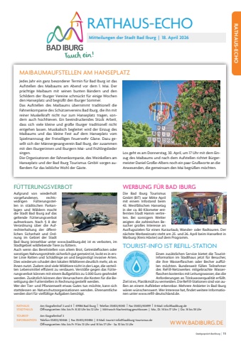 Stadtgespr%u00e4ch Bad Iburg | 15Jedes Jahr ein ganz besonderer Termin f%u00fcr Bad Iburg ist das Aufstellen des Maibaums am Abend vor dem 1. Mai. Der pr%u00e4chtige Maibaum mit seinen bunten B%u00e4ndern und den Schildern der Iburger Vereine schm%u00fcckt f%u00fcr einige Wochen den Hanseplatz und begr%u00fc%u00dft den Iburger Sommer.Das Aufstellen des Maibaums %u00fcbernimmt traditionell die Fahnenkompanie des Sch%u00fctzenvereins Bad Iburg, die ihn mit reiner Muskelkraft nicht nur zum Hanseplatz tragen, sondern auch hochhieven. Ein beeindruckendes St%u00fcck Arbeit, dass sich viele kleine und gro%u00dfe Iburger traditionell nicht entgehen lassen. Musikalisch begleitet wird der Einzug des Maibaums und das kleine Fest auf dem Hanseplatz vom Spielmannszug der Freiwilligen Feuerwehr Glane. Dazu gesellt sich der M%u00e4nnergesangverein Bad Iburg, der zusammen mit den Iburgerinnen und Iburgern Mai- und Fr%u00fchlingslieder singen. Die Organisatoren der Fahnenkompanie, des Weinkellers am Hanseplatz und der Bad Iburg Tourismus GmbH sorgen au%u00dferdem f%u00fcr das leibliche Wohl der G%u00e4ste. Los geht es am Donnerstag, 30. April, um 17 Uhr mit dem Einzug des Maibaums und nach dem Aufstellen richtet B%u00fcrgermeister Daniel Gro%u00dfe-Albers noch ein paar Gru%u00dfworte an die Anwesenden, die gemeinsam den Mai begr%u00fc%u00dfen m%u00f6chten. MAIBAUMAUFSTELLEN AM HANSEPLATZTOURIST-INFO IST REFILL-STATIONEinen zus%u00e4tzlichen Service bietet die TouristInformation im Stadthaus jetzt f%u00fcr Besucher, die ihre Wasserflaschen oder Becher auff%u00fcllen m%u00f6chten. Bundesweit f%u00fcllen Teilnehmer des ReFill-Netzwerkes mitgebrachte Wasserflaschen kostenlos mit Leitungswasser, das die Anforderungen an Trinkwasserqualit%u00e4t erf%u00fcllt. Ziel ist es, Plastikm%u00fcll zu vermeiden. Die ReFill-Stationen sind von au%u00dfen an einem Aufkleber erkennbar. Mehrere Anbieter in Bad Iburg w%u00e4ren w%u00fcnschenswert. Wer Interesse hat, findet weitere Informationen unter www.refill-deutschland.de.WERBUNG F%u00dcR BAD IBURGDie Bad Iburg Tourismus GmbH (BIT) war Mitte April mit einem Infostand beim 43. Westf%u00e4lischen Hansetag in der ca. 80 Kilometer entfernten Stadt Hamm vertreten. Bei sonnigem Wetter zeigten die zahlreichen Besucher gro%u00dfes Interesse an Ausflugszielen f%u00fcr einen Kurzurlaub, Wander- oder Radtouren. Der n%u00e4chste Werbeeinsatz steht am 25. und 26. April beim Hansefest in Warburg (Kreis H%u00f6xter) auf dem Programm.F%u00dcTTERUNGSVERBOTAufgrund von wiederholt vorgefundenen, rechtswidrigen F%u00fctterungsstellen in st%u00e4dtischen Parkanlagen und W%u00e4ldern macht die Stadt Bad Iburg auf das geltende F%u00fctterungsverbot aufmerksam. Nach %u00a7 8 der Verordnung %u00fcber die Aufrechterhaltung der %u00f6ffentlichen Sicherheit und Ordnung im Gebiet der Stadt Bad Iburg (einsehbar unter www.badiburg.de) ist es verboten, im Stadtgebiet wildlebende Tiere zu f%u00fcttern.Auch wenn das Bereitstellen von altem Brot, Getreideflocken oder sonstigen Nahrungsmitteln sicherlich gut gemeint ist, lockt es in erster Linie Ratten und Sch%u00e4dlinge an und beg%u00fcnstigt invasive Arten. Dies wiederum schadet den lokalen Wildtieren deutlich mehr, als es ihnen nutzt. Zudem sind viele Wildtiere nicht in der Lage, die verteilten Lebensmittel effizient zu verdauen. Verst%u00f6%u00dfe gegen das F%u00fctterungsverbot k%u00f6nnen mit einem Bu%u00dfgeld bis zu 5.000 Euro geahndet werden. Zus%u00e4tzlich k%u00f6nnen den Verursachern die Kosten f%u00fcr die Beseitigung der Futterstellen in Rechnung gestellt werden.Wer der Tier- und Pflanzenwelt etwas Gutes tun m%u00f6chte, kann sich stattdessen an Naturschutzorganisationen wenden. Ehrenamtliche werden dort f%u00fcr vielf%u00e4ltige Aufgaben ben%u00f6tigt.RATHAUS-ECHOMitteilungen der Stadt Bad Iburg | 18. April 2026 RATHAUS-ECHOWWW.BADIBURG.DERATHAUS Am Gografenhof 3 und 4 | 49186 Bad Iburg | Telefon 05403/4040 | Fax 05403/40499 | E-Mail: info@badiburg.deSTADTHAUS %u00d6ffnungszeiten: Mo. bis Fr. 8.30 Uhr bis 12 Uhr | Mittwoch Nachmittag geschlossen | Mo., Di. 14 bis 17 Uhr | Do. 14 bis 18 UhrTOURIST- Am Gografenhof 3INFORMATION Telefon 05403/40466 | Fax 05403/40486 | E-Mail: tourist-info@badiburg-tourismus.de%u00d6ffnungszeiten: Mo. bis Fr. 9 bis 13 Uhr und 14 bis 17 Uhr %u00b7 Sa. 10 bis 13 Uhr