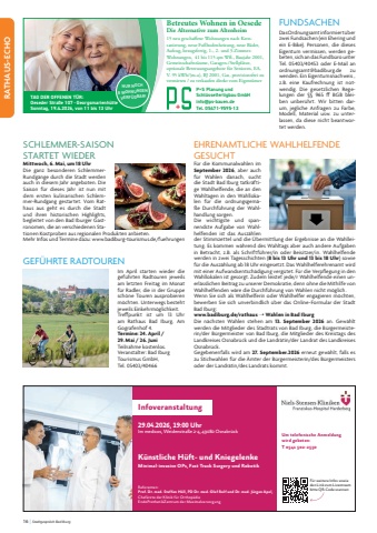 16 | Stadtgespr%u00e4ch Bad Iburg29.04.2026, 19:00 UhrIm medicos, Weidenstra%u00dfe 2-4, 49080 Osnabr%u00fcckReferenten:Prof. Dr. med. Steffen H%u00f6ll, PD Dr. med. Olaf Rolf und Dr. med. J%u00fcrgen Apel, Chef%u00e4rzte der Klinik f%u00fcr Orthop%u00e4die EndoProthetikZentrum der MaximalversorgungK%u00fcnstliche H%u00fcft- und KniegelenkeMinimal-invasive OPs, Fast Track Surgery und RobotikUm telefonische Anmeldung wird gebeten:T 0541 502-2550F%u00fcr weitere Infos sowieden Link zum Livestream bitte QR-Code scannenInfoveranstaltungWohnen-in-Oesede.deDie Alternative zum Altenheim15 neu geschaffene Wohnungen nach Kernsanierung, neue Fu%u00dfbodenheizung, neue B%u00e4der, Aufzug, bezugsfertig, 1%u00ad, 2%u00ad und 3%u00adZimmerWohnungen, 41 bis 115 qm Wfl., Baujahr 2001, Gemeinschaftsr%u00e4ume, Garagen%u00ad/Stellpl%u00e4tze, optionale Betreuungsangebote f%u00fcr Senioren, EA, V. 95 kWh/(m%u00ada), BJ 2001, Gas, provisionsfrei zuvermieten / zu verkaufen direkt vom Eigent%u00fcmerP+S Planung und Schl%u00fcsselfertigbau GmbH info@ps-bauen.de Tel. 05471-9595-13OFFENE BESICHTIGUNG: Oeseder Stra%u00dfe 107 %u00b7 Georgsmarienh%u00fctte Sonntag, 8.2.2026, von 11 bis 13 UhrP+S GmbHBremer Stra%u00dfe 2449163 Bohmte05471-9595-13info@ps-bauen.deWIR SIND AUF DER SUCHE!Sie m%u00f6chten Ihre Immobilie oderIhr Grundst%u00fcck verkaufen? Einfach direkt, ohne Umwege kaufenwir Ein- und Mehrfamilienh%u00e4user,B%u00fcrogeb%u00e4ude, Bauernh%u00f6fe und Hotelsf%u00fcr neue Projekte, zur Kapitalanlageund Bestandserweiterung. Gerne auch renovierungsbed%u00fcrftigsowie Erbpachtgrundst%u00fccke.RUFEN SIE DIREKT AN:TAG DER OFFENEN T%u00dcR: Oeseder Stra%u00dfe 107 %u00b7 Georgsmarienh%u00fctte Sonntag, 19.4.2026, von 11 bis 13 UhrNUR NOCH 8 WOHNUNGEN VERF%u00dcGBAR!Betreutes Wohnen in Oesede FUNDSACHENDas Ordnungsamt informiert %u00fcberzwei Fundsachen (ein Ehering und ein E-Bike). Personen, die dieses Eigentum vermissen, werden gebeten, sich an das Fundb%u00fcro unterTel. 05403/40453 oder E-Mail an ordnungsamt@badiburg.de zu wenden. Ein Eigentumsnachweis ,z.B. eine Kaufrechnung ist notwendig. Die gesetzlichen Regelungen der %u00a7%u00a7 965 ff BGB bleiben unber%u00fchrt. Wir bitten darum, jegliche Anfragen zu Farbe, Modell, Material usw. zu unterlassen, da diese nicht beantwortet werden. EHRENAMTLICHE WAHLHELFENDE GESUCHTF%u00fcr die Kommunalwahlen im September 2026, aber auch f%u00fcr Wahlen danach, sucht die Stadt Bad Iburg tatkr%u00e4ftige Wahlhelfende, die an den Wahltagen in den Wahllokalen f%u00fcr die ordnungsgem%u00e4%u00dfe Durchf%u00fchrung der Wahlhandlung sorgen.Die wichtigste und spannendste Aufgabe von Wahlhelfenden ist das Ausz%u00e4hlen der Stimmzettel und die %u00dcbermittlung der Ergebnisse an die Wahlleitung. Es kommen w%u00e4hrend des Wahltags aber auch andere Aufgaben in Betracht, z.B. als Schriftf%u00fchrer/in oder Beisitzer/in. Wahlhelfende werden in zwei Tagesschichten (8 bis 13 Uhr und 13 bis 18 Uhr) sowie f%u00fcr die Ausz%u00e4hlung ab 18 Uhr eingesetzt. Das Wahlhelferehrenamt wird mit einer Aufwandsentsch%u00e4digung verg%u00fctet. F%u00fcr die Verpflegung in den Wahllokalen ist gesorgt. Zudem leistet jede/r Wahlhelfende einen unerl%u00e4sslichen Beitrag zu unserer Demokratie, denn ohne die Mithilfe von Wahlhelfenden w%u00e4re die Durchf%u00fchrung von Wahlen nicht m%u00f6glich.Wenn Sie sich als Wahlhelferin oder Wahlhelfer engagieren m%u00f6chten, bewerben Sie sich unverbindlich %u00fcber das Online-Formular der Stadt Bad Iburg:www.badiburg.de/rathaus %u279d Wahlen in Bad IburgDie n%u00e4chsten Wahlen stehen am 13. September 2026 an. Gew%u00e4hlt werden die Mitglieder des Stadtrats von Bad Iburg, die B%u00fcrgermeisterin/der B%u00fcrgermeister von Bad Iburg, die Mitglieder des Kreistags des Landkreises Osnabr%u00fcck und die Landr%u00e4tin/der Landrat des Landkreises Osnabr%u00fcck.Gegebenenfalls wird am 27. September.2026 erneut gew%u00e4hlt, falls es zu Stichwahlen f%u00fcr die %u00c4mter der B%u00fcrgermeisterin/des B%u00fcrgermeisters oder der Landr%u00e4tin/des Landrats kommt.SCHLEMMER-SAISON STARTET WIEDERMittwoch, 6. Mai, um 18 UhrDie ganz besonderen SchlemmerRundg%u00e4nge durch die Stadt werden auch in diesem Jahr angeboten. Die Saison f%u00fcr dieses Jahr ist nun mit dem ersten kulinarischen Schlemmer-Rundgang gestartet. Vom Rathaus aus geht es durch die Stadt und ihren historischen Highlights, begleitet von den Bad Iburger Gastronomen, die an verschiedenen Stationen Kostproben aus regionalen Produkten anbieten. Mehr Infos und Termine dazu: www.badiburg-tourismus.de/fuehrungen GEF%u00dcHRTE RADTOURENIm April starten wieder die gef%u00fchrten Radtouren jeweils am letzten Freitag im Monat f%u00fcr Radler, die in der Gruppe sch%u00f6ne Touren ausprobieren m%u00f6chten. Unterwegs besteht jeweils Einkehrm%u00f6glichkeit.Treffpunkt ist um 13 Uhr am Rathaus Bad Iburg, Am Gografenhof 4.Termine: 24. April / 29. Mai / 26. JuniTeilnahme kostenlos. Veranstalter: Bad Iburg Tourismus GmbH, Tel. 05403/40466 RATHAUS-ECHO