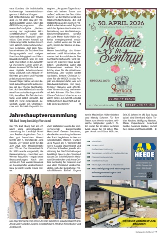 Stadtgespr%u00e4ch Bad Iburg | 19MarkisenInnen- undAu%u00dfenbeschattungTerrassen- und Lammellend%u00e4cherGlassschiebew%u00e4ndeInsektenschutzMontage, Service & ReparaturNeu: Reinigung und Wartung vonWintergartenanlagen undTerrassend%u00e4chernPferdestra%u00dfe 4749084 Osnabr%u00fcck0541 - 500 5400IHR NEUER LIEBLINGSPLATZ:DRAUSSENmehr aufwww.heede.devate Kunden, die individuelle, hochwertige Inneneinrichtungen nach Ma%u00df nachfragen. Mit Unterst%u00fctzung der WIGOS ging es mit dem Bau der Produktionsst%u00e4tte voran. %u00dcber das GRW-F%u00f6rderprogramm (Gemeinschaftsaufgabe %u201eVerbesserung der regionalen Wirtschaftsstruktur%u201c) wurde das Unternehmen finanziell unterst%u00fctzt. Den ersten Ansto%u00df zur F%u00f6rderung hatte Andrea Frosch vom WIGOS-UnternehmensService gegeben: %u201eMit dem Neubau erweitert die Tischlerei ihre Fertigungstiefe und steigert ihre Unabh%u00e4ngigkeit und Wettbewerbsf%u00e4higkeit. Das ist eine gute Investition in die Zukunft.%u201c So investierte Licher unter anderem in neue CNC-Technik und eine digitale Arbeitsvorbereitung, wodurch sich Abl%u00e4ufe effizienter gestalten und Projekte pr%u00e4ziser planen lassen. Ein wichtiger Faktor, um den Betrieb zukunftsgerecht aufzustellen, ist das Thema Nachhaltigkeit. Auf dem Hallendach wurde eine Photovoltaikanlage mit 474 kWp installiert. Ein Teil der Leistung wird selbst genutzt, der Rest ins Netz eingespeist. Zus%u00e4tzlich wurde ein Stromspeicher mit 30 kWh Kapazit%u00e4t integriert. %u201eAn guten Tagen brauchen wir keinen Strom von au%u00dfen%u201c, erl%u00e4utert der Gesch%u00e4ftsf%u00fchrer. F%u00fcr die W%u00e4rme sorgt eine Hackschnitzelheizung, die mit Holzresten aus der eigenen Produktion betrieben wird. Erg%u00e4nzt wird das System durch eine Hallenheizung aus HochleistungsDeckenstrahlplatten, welche die acht Meter hohe Halle m%u00fchelos energiesparend erw%u00e4rmen. %u201eSelbst wenn ein Tor aufgeht, bleibt die W%u00e4rme im Bauk%u00f6rper.%u201c Heute besch%u00e4ftigt das Unternehmen zw%u00f6lf Mitarbeiter, darunter drei Auszubildende. Der Fachkr%u00e4ftenachwuchs wird bewusst im eigenen Haus ausgebildet. Gleichzeitig sucht das Unternehmen weitere Fachkr%u00e4fte, etwa f%u00fcr die Arbeitsvorbereitung. %u201eWir wollen weiter wachsen%u201c, betont Christian Licher. F%u00fcr die WIGOS ist das Projekt ein Beispiel daf%u00fcr, wie sich Handwerksbetriebe mit langfristiger Planung und %u00f6ffentlicher Unterst%u00fctzung weiterentwickeln k%u00f6nnen. F%u00fcr Gesch%u00e4ftsf%u00fchrer Christian Licher ist es vor allem eines: %u201eEin Schritt, um das Unternehmen dauerhaft auf solide Beine zu stellen.%u201c oJahreshauptversammlungVfL Bad Iburg best%u00e4tigt VorstandDer VfL Bad Iburg hat am 27. M%u00e4rz seine Jahreshauptversammlung im Landidyll Hotel zum Freden abgehalten. Durch den gut besuchten Abend f%u00fchrte der 1. Vorsitzende J%u00f6rg Nuxoll. Der Verein peilt f%u00fcr das Jahr 2026 eine Mitgliederzahl von 700 an. Der Kassenbericht f%u00fcr 2025 wurde vorgestellt; die Kassenpr%u00fcfung %u2013 berichtet von Werner Rosumek %u2013 ergab keine Beanstandungen. Nach drei Jahren im Amt wurde Rosumek als Kassenpr%u00fcfer verabschiedet. Neu gew%u00e4hlt wurde Frank P%u00f6tter.Zum Wahlleiter wurde der stellvertretende B%u00fcrgermeister Hans-Josef Geesen bestimmt, der die Versammlung im Namen der Stadt begleitete. In den anschlie%u00dfenden Wahlen wurden J%u00f6rg Nuxoll als 1. Vorsitzender sowie Claudia Stapenhorst und Christian Schnellen jeweils einstimmig bei f%u00fcnf Enthaltungen best%u00e4tigt. Neu in den Vorstand r%u00fccken als Schriftf%u00fchrerin Heidrun Kleinebecker und Anna Oellers zust%u00e4ndig f%u00fcr Finanzen auf. Aus dem Vorstand verabschiedeten sich die langj%u00e4hrige Protokollf%u00fchrerin B%u00e4rbel J%u00fcrgens sowie Maximilian H%u00f6ltershinken und Mandy Schowe. F%u00fcr ihre Treue zum Verein wurden zahlreiche Mitglieder geehrt: Allen voran f%u00fcr 50 Jahre Gerlinde Geck sowie f%u00fcr 40 Jahre Margret Arndt und Klaus H%u00f6lscher. Seit 25 Jahren im VfL Bad Iburg dabei sind Bernhard Gaile, Tobias Nauber, Wolfgang Nauber, Maria Papenbrock; Reinhard Robbe, Susanne B%u00fccker, Daniel Ken, Heiko und Marion Rott. oDer neue Vorstand. Von links: Christian Schnellen, Claudia Stapenhorst, Anna Oellers, B%u00e4rbel J%u00fcrgens (verabschiedet), Heidrun Kleinebecker und J%u00f6rg Nuxoll. Foto: VfL Bad Iburg