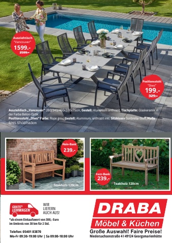 Stadtgespr%u00e4ch Bad Iburg | 25GRATIS*LEIHWAGENTelefon: 05401 83870Mo-Fr 09:30-19:00 Uhr | Sa 09:00-18:00 Uhr*ab einem Einkaufswert von 300,- Euro Sessel Villa Nova im Umkreis von 30 km f%u00fcr 2 Std.Gestell: Alu beige, Bezug: Rope beige,inkl. AuflagenIM UMKREIS!Niedersachsenstra%u00dfe 4 I 49124 Georgsmarienh%u00fctteGro%u00dfe Auswahl! Faire %u0005reise!WIRLIEFERNAUCH AUS!GRATIS*LEIHWAGEN349,-Dining Sessel%u201cTerrano%u201d649,-749,-1199,-STARTKLAR F%u00dcR DEN SOMMER?Esstisch%u201cComo%u201d999,-699,-199,-Esstisch Como: Spider Gestell, Platte Sinterstone beige 220x100x75cm349,-Stuhl%u201cBari%u201dLifttisch Terrano: h%u00f6henverstellbar 180x90cm, H%u00f6he 50-69cm, Platte Sinterstone beige82x82x67cmDining Sofa%u201cTerrano%u201d204x82x67cmLifttisch Terrano1099,- jetzt 699,-Angebot g%u00fcltig bis zum 30.04.261599.-2599.-Ausziehtisch%u201cVancouver%u201dPositionsstuhl%u201cDiwo%u201d199.-329.-Ausziehtisch %u201eVancouver%u201c 280/340/400x100x75cm, Gestell: Aluminium anthrazit, Tischplatte: Glaskeramik inder Farbe Beton-OptikPositionsstuhl %u201eDiwo%u201c Farbe: Rope grau, Gestell: Aluminium, anthrazit inkl. Sitzkissen Sunbrella-Stoff, Ma%u00dfeB/H/L 57x107x63cmMoin-Bank239.-Teakholz 120cmHerz-Bank239.-Teakholz 120cm