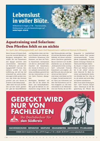28 | Anzeigen-SonderteilWillkommen in Hagen a.T.W. %u2013 Tourismusinfos, Bl%u00fchbarometer und alle Veranstaltungen auf www.hagen-atw.deLebenslust in voller Bl%u00fcte.26_04_Hagen_aTW_Anzeige_Lebenslust_1-4tel_Seite_HMB_ly_01.indd 6 01.04.26 12:14GEDECKT WIRD NUR VONFACHLEUTENIhr Dachdecker f%u00fcr den S%u00fcdkreis%u25aa DACHEINDECKUNG %u25aa REPARATUR %u25aa WARTUNG %u25aa KRANARBEITEN %u25aa DACHCHECK %u25aa PV-ANLAGENWEBER DACH GmbH & Co. KG | 49170 Hagen a. T. W. | 05401 33 99 971 | www.weberdach.deAquatraining und Solarium: Den Pferden fehlt es an nichtsSo l%u00e4uft das Alltagsgesch%u00e4ft auf dem Hof Kasselmann w%u00e4hrend Horses & Dreams Wenn Horses & Dreams l%u00e4uft, muss der normale Betrieb am Borgberg weitergehen. Wie schafft der Hof Kasselmann den Spagat zwischen dem renommierten internationalen Reitturnier und dem Alltagsgesch%u00e4ft? Francois Kasselmann erz%u00e4hlt bei einer Hoff%u00fchrung, wie sich der Hof entwickelt hat, welche Anforderungen erf%u00fcllt werden m%u00fcssen, was hinter den Kulissen passiert und wie Horses & Dreams in den Ablauf passt. %u201eMein Vater hat noch mit Pferden auf dem Acker gearbeitet%u201c, gibt der Gesch%u00e4ftsf%u00fchrer und Sportliche Leiter von Horses & Dreams eine kleine geschichtliche Einweisung zum Anwesen, auf dem die Familie Kasselmann nachweislich seit dem 12. Jahrhundert lebt. Hausherr Ulli Kasselmann, der Horses & Dreams zu einer weltweit anerkannten Adresse und Marke gemacht hat, hat das Unternehmen an seinen Sohn Francois %u00fcbergeben. Wichtigstes Standbein auf dem Hof ist die Arbeit mit Deck- und Verkaufspferden. Wie gro%u00df der Betrieb ist, verdeutlichen einige Zahlen. Mit 250 Dressurpferden wird t%u00e4glich auf dem 65 Hektar gro%u00dfen Gel%u00e4nde mit seinen verschiedenen Quartieren gearbeitet. Darum k%u00fcmmern sich 110 Mitarbeitende aus 23 Nationen. %u201eAmtssprache ist bei uns Englisch%u201c, schmunzelt Francois Kasselmann und erg%u00e4nzt. %u201eEs gibt Personal, das seit %u00fcber 40 Jahren auf dem Hof ist.%u201c Und immer sind G%u00e4ste vor Ort in Hagen. Zurzeit bereitet sich ein Team aus Indonesien auf dem Hof Kasselmann auf h%u00f6here Aufgaben vor. Die Internationalit%u00e4t ist ein Markenzeichen der Familie, die ein Winterquartier in Loxahatchee/Florida besitzt. Dort werden vielversprechende Turnierpferde ausgebildet, die beim Global Dressage Festival ihr Talent unter Beweis stellen.Zu Hause in Hagen wird ein Pferd zum Verkauf vorbereitet. In der %u201eKlinik%u201c untersuchen Veterin%u00e4r Dr. Mark Kaminski und Assistentin Katharina Sch%u00fctte das Tier. %u201eDas ist so, als w%u00fcrde man einen Bayern-Spieler transferieren. Alles muss seine Ordnung haben%u201c, lacht Francois Kasselmann. %u00dcberhaupt ist die Begutachtung der Pferde das