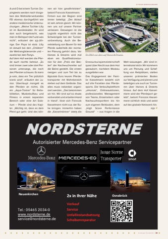 Anzeigen-Sonderteil | 2920 YEARS HORSES & DREAMSA und O bei einem Turnier. Dopingtests werden nach Vorgaben des Weltreiterverbandes FEI ebenso durchgef%u00fchrt wie andere medizinische Untersuchungen. %u201eMeine Tochter Lillyist im Bundeskader. Ihr wird dort auch beigebracht, was man im Reitsport darf und was nicht%u201c, erl%u00e4utert der 43-J%u00e4hrige. Der Papa ist stolz. Lilly ist aktuell bei den %u201eChildren%u201c die Weltranglistenerste und %u2013zweite bei den Ponys. Auf dem Hof werden die Pferde auch nachts betreut. %u201eEs sind immer zwei oder drei Personen unterwegs, die nach den Pferden schauen. Es kann ja sein, dass ein Tier pl%u00f6tzlich krank wird%u201c, erl%u00e4utert der Junior. %u00dcberhaupt mangelt es den Pferden an nichts. Ob ein %u201eAqua-Trainer%u201c f%u00fcr Rehabilitation, Muskelaufbau und Fitness in einem separaten Bereich oder eine Art Solarium %u2013 Pferde sind das Kapital. %u201eWichtig ist, dass es dem Pferd gut geht. Und das k%u00f6nnen wir hier gew%u00e4hrleisten%u201c, betont Francois Kasselmann.Firmen aus der Region sind immer beteiligt. %u201eDer Ablauf ist seit Jahren gleich. Wir k%u00f6nnen uns auf unsere Partner verlassen. Deswegen ist die Logistik eigentlich nicht das Schwierigste bei der Turniervorbereitung. Auch die Bereitstellung von Boxen f%u00fcr 100 Pferde au%u00dferhalb der normalen Planung geh%u00f6rt dazu. Vor Horses & Dreams wird mal eben ein Qualifikationsturnier f%u00fcr den %u201ePreis der Besten%u201c der Nachwuchsreiter auf die Beine gestellt. Die ersten riesigen und zum Teil bis zu 650.000 Euro teuren Pferdetransporter mit Wohnbereich stehen auf dem Gel%u00e4nde. Das alles muss nebenbei organisiert werden. %u201eDas bekommen wir hin. Wir sind auf so etwas vorbereitet und arbeiten Hand in Hand%u201c, l%u00e4sst sich Francois Kasselmann nicht aus der Ruhe bringen. Immerhin haben die %u201eKasselm%u00e4nner%u201c 2005 die Dressureuropameisterschaft quasi %u00fcber Nacht aus dem Hut gezaubert, nachdem Moskau ausgefallen war. Das Engagement der Familie Kasselmann bezieht sich auf alle Facetten des Pferdesports. Die Verkaufsplattform %u201eeHorses%u201c, Onlineauktionen, professionelles Management von Teams, Einzelreitern oder Nachwuchssportlern bis hin zum eigenen Reitboden, dem %u201eHigh Score Performance Ground%u201c %u2013 aus Hagen in die Welt sozusagen. %u201eWir sind international aktiv. Wir k%u00fcmmern uns um Planung und Schaffung von Reitpl%u00e4tzen, stellen unseren pr%u00e4mierten Boden zur Verf%u00fcgung und planen und beteiligen uns auch an Turnieren %u00fcber Horses & Dreams hinaus. Auf dem Hof Kasselmann wird der Pferdsport gelebt%u201c, betont Francois Kasselmann sichtlich stolz und weist auf das globale Netzwerk hin. mjoNORDSTERNEAutorisierter Mercedes-Benz ServicepartnerNeuenkirchen 2x in Ihrer N%u00e4he Osnabr%u00fcckVerkaufService UnfallinstandsetzungScheibenreparaturTel.: 05465 2034-0www.nordsterne.deservice@nordsterne.deEin Blick von oben auf Horses&Dreams.Foto: Horses and Dreams Entertainment GmbH