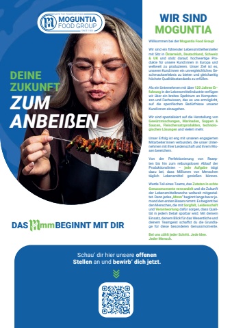 38 | Stadtgespr%u00e4ch Bad IburgDEINEZUKUNFTZUMANBEI%u00dfENDAS MMM BEGINNT MIT DIRMOGUNTIAFOOD GROUPTASTE THE POWER OF FOODSINCE 1903WIR SIND MOGUNTIAWIR SUCHEN DICHin Georgsmarienh%u00fcttePRODUKTIONSMITARBEITER:INFACHKRAFT F%u00dcR LEBENSMITTELTECHNIKMECHANTRONIKER:IN / SCHLOSSER:INMASCHINEN- UND ANLAGENF%u00dcHRER:INWillkommen bei der Moguntia Food Group!Wir sind ein f%u00fchrender Lebensmittelhersteller mit Sitz in %u00d6sterreich, Deutschland, Schweiz & UK und stolz darauf, hochwertige Produkte f%u00fcr unsere Kund:innen in Europa und weltweit zu produzieren. Unser Ziel ist es, unseren Kund:innen ein unvergleichliches Geschmackserlebnis zu bieten und gleichzeitig h%u00f6chste Qualit%u00e4tsstandards zu erf%u00fcllen.Als ein Unternehmen mit %u00fcber 120 Jahren Erfahrung in der Lebensmittelindustrie verf%u00fcgen wir %u00fcber ein breites Spektrum an Kompetenzen und Fachwissen, das es uns erm%u00f6glicht, auf die spezifischen Bed%u00fcrfnisse unserer Kund:innen einzugehen.Wir sind spezialisiert auf die Herstellung von Gew%u00fcrzmischungen, Marinaden, Suppen & Saucen, Fleischersatzprodukten, technologischen L%u00f6sungen und vielem mehr.Unser Erfolg ist eng mit unseren engagierten Mitarbeiter:innen verbunden, die unser Unternehmen mit ihrer Leidenschaft und ihrem Wissen bereichern.Von der Perfektionierung von Rezepten bis hin zum reibungslosen Ablauf der Produktionslinien %u2013 jede Aufgabe tr%u00e4gt dazu bei, dass Millionen von Menschen t%u00e4glich Lebensmittel genie%u00dfen k%u00f6nnen.Werde Teil eines Teams, das Zutaten in echte Genussmomente verwandelt und die Zukunft der Lebensmittelbranche weltweit mitgestaltet. Denn jedes %u201eMmm%u201c beginnt lange bevor jemand den ersten Bissen nimmt. Es beginnt bei den Menschen, die mit Sorgfalt, Leidenschaftund Verantwortung daf%u00fcr sorgen, dass Qualit%u00e4t in jedem Detail sp%u00fcrbar wird. Mit deinem Einsatz, deinem Blick f%u00fcr das Wesentliche und deinem Teamgeist schaffst du die Grundlage f%u00fcr diese besonderen Genussmomente.Bei uns z%u00e4hlt jeder Schritt. Jede Idee. Jeder Mensch.Ob Profi oder Quereinsteiger %u2013 du packst gerne an? Dann unterst%u00fctze unsere Produktion mit deinen F%u00e4higkeiten.Zur Verst%u00e4rkung unseres Teams suchen wir Produktionsmitarbeiter (m/w/d), die motiviert sind, gemeinsam mit uns f%u00fcr einen reibungslosen Produktionsablauf zu sorgen.Du hast Freude daran, Produktionsanlagen zu bedienen, Lebensmittel nach h%u00f6chsten Qualit%u00e4tsstandards herzustellen und dabei sorgf%u00e4ltig zu arbeiten? Dann unterst%u00fctze unser Team als Fachkraft f%u00fcr Lebensmitteltechnik (m/w/d) und sorge gemeinsam mit uns f%u00fcr besondere Genussmomente unserer Kunden.Du hast ein H%u00e4ndchen f%u00fcr Technik und Maschinen & arbeitest gerne praktisch? Dann bist du bei uns genau richtig. Zur Verst%u00e4rkung unseres Teams suchen wir einen engagierten Mechatroniker / Schlosser (m/w/d), der mit technischem Verst%u00e4ndnis, handwerklichem Geschick und Teamgeist %u00fcberzeugt.Maschinen bedienen, Produktionsanlagen %u00fcberwachen und f%u00fcr einen reibungslosen Ablauf sorgen ist dein Ding? Dann unterst%u00fctze unser Team als Maschinenund Anlagenf%u00fchrer (m/w/d) und trage zu einer effizienten und zuverl%u00e4ssigen Produktion bei.Schau%u2018 dir hier unsere offenenStellen an und bewirb%u2018 dich jetzt.DEINEZUKUNFTZUMANBEI%u00dfENDAS MMM BEGINNT MIT DIRMOGUNTIAFOOD GROUPTASTE THE POWER OF FOODSINCE 1903WIR SIND MOGUNTIAWIR SUCHEN DICHin Georgsmarienh%u00fcttePRODUKTIONSMITARBEITER:INFACHKRAFT F%u00dcR LEBENSMITTELTECHNIKMECHANTRONIKER:IN / SCHLOSSER:INMASCHINEN- UND ANLAGENF%u00dcHRER:INWillkommen bei der Moguntia Food Group!Wir sind ein f%u00fchrender Lebensmittelhersteller mit Sitz in %u00d6sterreich, Deutschland, Schweiz & UK und stolz darauf, hochwertige Produkte f%u00fcr unsere Kund:innen in Europa und weltweit zu produzieren. Unser Ziel ist es, unseren Kund:innen ein unvergleichliches Geschmackserlebnis zu bieten und gleichzeitig h%u00f6chste Qualit%u00e4tsstandards zu erf%u00fcllen.Als ein Unternehmen mit %u00fcber 120 Jahren Erfahrung in der Lebensmittelindustrie verf%u00fcgen wir %u00fcber ein breites Spektrum an Kompetenzen und Fachwissen, das es uns erm%u00f6glicht, auf die spezifischen Bed%u00fcrfnisse unserer Kund:innen einzugehen.Wir sind spezialisiert auf die Herstellung von Gew%u00fcrzmischungen, Marinaden, Suppen & Saucen, Fleischersatzprodukten, technologischen L%u00f6sungen und vielem mehr.Unser Erfolg ist eng mit unseren engagierten Mitarbeiter:innen verbunden, die unser Unternehmen mit ihrer Leidenschaft und ihrem Wissen bereichern.Von der Perfektionierung von Rezepten bis hin zum reibungslosen Ablauf der Produktionslinien %u2013 jede Aufgabe tr%u00e4gt dazu bei, dass Millionen von Menschen t%u00e4glich Lebensmittel genie%u00dfen k%u00f6nnen.Werde Teil eines Teams, das Zutaten in echte Genussmomente verwandelt und die Zukunft der Lebensmittelbranche weltweit mitgestaltet. Denn jedes %u201eMmm%u201c beginnt lange bevor jemand den ersten Bissen nimmt. Es beginnt bei den Menschen, die mit Sorgfalt, Leidenschaftund Verantwortung daf%u00fcr sorgen, dass Qualit%u00e4t in jedem Detail sp%u00fcrbar wird. Mit deinem Einsatz, deinem Blick f%u00fcr das Wesentliche und deinem Teamgeist schaffst du die Grundlage f%u00fcr diese besonderen Genussmomente.Bei uns z%u00e4hlt jeder Schritt. Jede Idee. Jeder Mensch.Ob Profi oder Quereinsteiger %u2013 du packst gerne an? Dann unterst%u00fctze unsere Produktion mit deinen F%u00e4higkeiten.Zur Verst%u00e4rkung unseres Teams suchen wir Produktionsmitarbeiter (m/w/d), die motiviert sind, gemeinsam mit uns f%u00fcr einen reibungslosen Produktionsablauf zu sorgen.Du hast Freude daran, Produktionsanlagen zu bedienen, Lebensmittel nach h%u00f6chsten Qualit%u00e4tsstandards herzustellen und dabei sorgf%u00e4ltig zu arbeiten? Dann unterst%u00fctze unser Team als Fachkraft f%u00fcr Lebensmitteltechnik (m/w/d) und sorge gemeinsam mit uns f%u00fcr besondere G