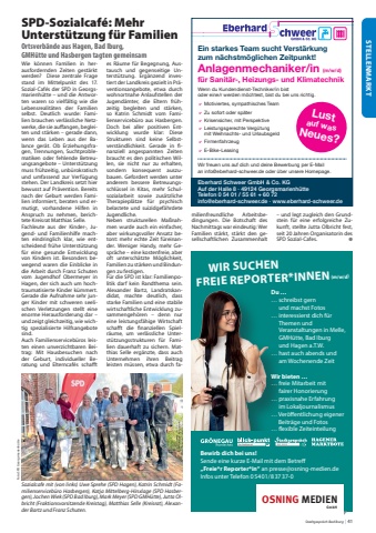 Stadtgespr%u00e4ch Bad Iburg | 41STELLENMARKTOSNING MEDIENGmbHWIR SUCHENFREIE REPORTER*INNEN (m/w/d)Du %u2026%u2026 schreibst gern und machst Fotos%u2026 interessierst dich f%u00fcr Themen und Veranstaltungen in Melle, GMH%u00fctte, Bad Iburg und Hagen a.T.W.%u2026 hast auch abends und am Wochenende ZeitWir bieten %u2026%u2026 freie Mitarbeit mit fairer Honorierung%u2026 praxisnahe Erfahrung im Lokaljournalismus%u2026 Ver%u00f6ffentlichung eigener Beitr%u00e4ge und Fotos%u2026 flexible ZeiteinteilungBewirb dich bei uns!Sende eine kurze E-Mail mit dem Betreff %u201eFreie*r Reporter*in%u201c an presse@osning-medien.deInfos unter Telefon 05401/83737-0HeizungSanit%u00e4rSolarPhotovoltaikKlempnerei49124 GMH%u00fctte Kloster OesedeAuf der Halle 8E-Mail: schweer@osnanet.deTel. (0 54 01) 55 61 + 60 72Fax (0 54 01) 57 80Schweer_C4Umschlag.indd 1 12.10.2009 7:45:54 UhrHeizungSanit%u00e4rSolarPhotovoltaikKlempnerei49124 GMH%u00fctte Kloster OesedeAuf der Halle 8E-Mail: schweer@osnanet.deTel. (0 54 01) 55 61 + 60 72Fax (0 54 01) 57 80Schweer_C4Umschlag.indd 1 12.10.2009 7:45:54 UhrIhr Haustechnik-ExperteLassEn aucH sIE sIcHscHwE(E)r bEgEIstErn!Wir sind ihr starker Partner in den Bereichen%u0087 Heizung, L%u00fcftung, Sanit%u00e4r%u0087 Wohlf%u00fchlb%u00e4der %u2013 auch barrierefrei%u0087 Solartechnik %u2013 erneuerbare Energien%u0087 Wartung, Kunden- und Notdienst%uf0fc%uf0fc%uf0fc%uf0fcEberhard Schweer GmbH & Co. KGAuf der Halle 849124 Georgsmarienh%u00fctteTel. 0 54 01 / 55 61 + 60 72 schweer@osnanet.dewww.eberhard-schweer.deHeizungSanit%u00e4rSolarWohnrauml%u00fcftungWWW.EBErHArd-SCHWEEr.dENOTdiENST 0173/5903817(AuCH Am WOCHENENdE)Ein starkes Team sucht Verst%u00e4rkung zum n%u00e4chstm%u00f6glichen Zeitpunkt!Anlagenmechaniker/in (m/w/d)f%u00fcr Sanit%u00e4r-, Heizungs- und KlimatechnikWenn du Kundendienst-Techniker/in bist oder eine/r werden m%u00f6chtest, bist du bei uns richtig.%uf061 Motiviertes, sympathisches Team%uf061 Zu sofort oder sp%u00e4ter%uf061 Krisensicher, mit Perspektive%uf061 Leistungsgerechte Verg%u00fctung mit Weihnachts- und Urlaubsgeld%uf061 Firmenfahrzeug%uf061 E-Bike-LeasingWir freuen uns auf dich und deine Bewerbung per E-Mail an info@eberhard-schweer.de oder %u00fcber unsere Homepage.Eberhard Schweer GmbH & Co. KGAuf der Halle 8 %u00b7 49124 Georgsmarienh%u00fctteTelefon 0 54 01 / 55 61 + 60 72info@eberhard-schweer.de %u00b7 www.eberhard-schweer.deLust auf wasNeues?SPD-Sozialcaf%u00e9: Mehr Unterst%u00fctzung f%u00fcr FamilienOrtsverb%u00e4nde aus Hagen, Bad Iburg, GMH%u00fctte und Hasbergen tagten gemeinsamWie k%u00f6nnen Familien in herausfordernden Zeiten gest%u00e4rkt werden? Diese zentrale Frage stand im Mittelpunkt des 17. Sozial-Caf%u00e9s der SPD in Georgsmarienh%u00fctte %u2013 und die Antworten waren so vielf%u00e4ltig wie die Lebensrealit%u00e4ten der Familien selbst. Deutlich wurde: Familien brauchen verl%u00e4ssliche Netzwerke, die sie auffangen, begleiten und st%u00e4rken %u2013 gerade dann, wenn das Leben aus der Balance ger%u00e4t. Ob Erziehungsfragen, Trennungen, Suchtproblematiken oder fehlende Betreuungsangebote %u2013 Unterst%u00fctzung muss fr%u00fchzeitig, unb%u00fcrokratisch und umfassend zur Verf%u00fcgung stehen. Der Landkreis setzt hier bewusst auf Pr%u00e4vention. Bereits nach der Geburt werden Familien informiert, beraten und ermutigt, vorhandene Hilfen in Anspruch zu nehmen, berichtete Kreisrat Matthias Selle.%u00a0Fachleute aus der Kinder-, Jugend- und Familienhilfe machten eindringlich klar, wie entscheidend fr%u00fche Unterst%u00fctzung f%u00fcr eine gesunde Entwicklung von Kindern ist. Besonders bewegend waren die Einblicke in die Arbeit durch Franz Schuten vom Jugendhof Obermeyer in Hagen, der sich auch um hochtraumatisierte Kinder k%u00fcmmert. Gerade die Aufnahme sehr junger Kinder mit schweren seelischen Verletzungen stellt eine enorme Herausforderung dar %u2013 und zeigt gleichzeitig, wie wichtig spezialisierte Hilfsangebote sind. Auch Familienserviceb%u00fcros leisten einen unverzichtbaren Beitrag: Mit Hausbesuchen nach der Geburt, individueller Beratung und Elterncaf%u00e9s schafft es R%u00e4ume f%u00fcr Begegnung, Austausch und gegenseitige Unterst%u00fctzung. Erg%u00e4nzend investiert der Landkreis gezielt in Pr%u00e4ventionsangebote, etwa durch wohnortnahe Anlaufstellen der Jugend%u00e4mter, die Eltern fr%u00fchzeitig begleiten und st%u00e4rken, so Katrin Schmidt vom Familienserviceb%u00fcro aus Hasbergen. Doch bei aller positiven Entwicklung wurde klar: Diese Strukturen sind keine Selbstverst%u00e4ndlichkeit. Gerade in finanziell angespannten Zeiten braucht es den politischen Willen, sie nicht nur zu erhalten, sondern konsequent auszubauen. Gefordert werden unter anderem bessere Betreuungsschl%u00fcssel in Kitas, mehr Schulsozialarbeit sowie zus%u00e4tzliche Therapiepl%u00e4tze f%u00fcr psychisch belastete und suizidgef%u00e4hrdete Jugendliche. Neben strukturellen Ma%u00dfnahmen wurde auch ein einfacher, aber wirkungsvoller Ansatz betont: mehr echte Zeit f%u00fcreinander. Weniger Handy, mehr Gespr%u00e4che %u2013 eine kostenfreie, aber oft untersch%u00e4tzte M%u00f6glichkeit, Familien zu st%u00e4rken und Bindungen zu festigen. F%u00fcr die SPD ist klar: Familienpolitik darf kein Randthema sein. Alexander Bartz, Landratskandidat, machte deutlich, dass starke Familien und eine stabile wirtschaftliche Entwicklung zusammengeh%u00f6ren %u2013 denn nur eine leistungsf%u00e4hige Wirtschaft schafft die finanziellen Spielr%u00e4ume, um verl%u00e4ssliche Unterst%u00fctzungsstrukturen f%u00fcr Familien dauerhaft zu sichern. Matthias Selle erg%u00e4nzte, dass auch Unternehmen ihren Beitrag leisten m%u00fcssen, etwa durch faSozialcafe mit (von links) Uwe Sprehe (SPD Hagen), Katrin Schmidt (Familienserviceb%u00fcro Hasbergen), Katja Mittelberg-Hinxlage (SPD Hasbergen), Jochen Wiek (SPD Bad Iburg), Mark Meyer (SPD GMH%u00fctte), Jutta Olbricht (Fraktionsvorsitzende Kreistag), Matthias Selle (Kreisrat), Alexander Bartz und Franz Schuten.Foto: