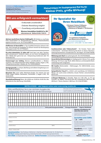 Stadtgespr%u00e4ch Bad Iburg | 43Bitte ver%u00f6ffentlichen Sie in der n%u00e4chsten Ausgabe des Stadtgespr%u00e4ch Bad Iburg folgende private Kleinanzeige:Name, VornameStra%u00dfe, PLZ/OrtTelefonKreditinstitut IBANDatum, UnterschriftGl%u00e4ubiger-Identifikations-Nr. DE88 ZZZ0 0002 2839 96Hiermit erm%u00e4chtige ich Sie, den Forderungsbetrag zu Lasten des Kontos mittels SEPA-Lastschrift einzuziehen.BESTELLSCHEIN %u2013 oder bequem online unter www.osning-medien.deBitte tragen Sie Ihren gew%u00fcnschten Text in Druckbuchstaben ein. F%u00fcr Buchstaben, Zeichen, Zahlen und Wortzwischenr%u00e4ume jeweils ein K%u00e4stchen.Annahmestellen: Das Posthaus: M%u00fchlentor 2, Bad Iburg & Osnabr%u00fccker Str. 29, Bad IburgPer Post: Stadtgespr%u00e4ch Bad Iburg, Siebenbachstra%u00dfe 3, 49124 Georgsmarienh%u00fcttePer E-Mail: anzeigen@osning-medien.de Online-Formular: www.osning-medien.de %ufffd AnzeigenGrundpreis inkl. MwSt. 12,00 %u20acChiffregeb%u00fchr 4,00 %u20ac Summe:Buchung %u00fcber die Webseite: 1 %u20ac g%u00fcnstiger!Zuschriften unter ChiffreN ja N neinBei Chiffre-Anzeigen werden eingehende Zuschriften sieben Tage nach der zuletzt erschienenen Ausgabe im verschlossenen Umschlag per Post zugeschickt (individuelle Absprachen sind m%u00f6glich).Bitte schalten Sie diese Anzeige mit jeweils neuer Berechnung auch in N blick-punkt Georgsmarienh%u00fctte N Gr%u00f6negau Rundschau N Hagener Marktboten Antworten auf Chiffre-Anzeigen senden Sie bitte mit Angabe der Chiffre-Nummer an Stadtgespr%u00e4ch Bad Iburg Siebenbachstra%u00dfe 3, 49124 Georgsmarienh%u00fctte oder per E-Mail an info@osning-medien.deKleinanzeigen im Stadtgespr%u00e4ch Bad Iburg: Kleiner Preis, gro%u00dfe Wirkung! www.kreuter-tankanlagenbau.deL%u00fcbecker Str. 8 %u00b7 49124 GMH %u00b7 Tel. 05401/8596-0 Reinigung Ausbau Stilllegung Modernisierung Neuanlagen Behebung von M%u00e4ngeln n. T%u00dcV-Abnahme Ihr zugelassener Fachbetrieb nach Wasserrecht mit G%u00fctezeichenIhr Spezialist f%u00fcr Ihren Heiz%u00f6ltankMit uns erfolgreich vermarkten!%u2022 Erstkontakt unverbindlich%u2022 Diskrete Abwicklung m%u00f6glich%u2022 Zuverl%u00e4ssig und professionellwww.wermes.deUst.-ID.Nr.:DE 61 266 614 940 771 224 300 %u25cf BIC Nr. : GENO DEF1 MEP %u25cf Steuer-Nr.:61/203/15121Wermes ImmobilienGmbH & Co. KGCharlottenburger Ring 20, 49186 Bad Iburg Telefon: 05403-795579Telefax: 05403-794401Bad Iburg, 27. November 2013F%u00fcr vorgemerkte Kunden st%u00e4ndig auf der Suche nach Immobilien im s%u00fcdl. Landkreis.Wir w%u00fcnschen Ihnen sch%u00f6ne Feiertage!!Charlottenburger Ring 20, 49186 Bad Iburg Tel: 05403 %u2013 79 55 79 oder www.wermes.de Ihr Ansprechpartner: Hubert EngelmeyerRechnung an:Wermes Immobilien GmbH & Co .KGNordring 1249733 HarenEmsl%u00e4ndische Volksbank - Konto Nr. 77 122 43 00 - BLZ: 266 614 94Wermes Immobilien GmbH & Co. KGinfo@wermes.de %u00b7 Telefon 05403/795579G%u00e4rtner macht Ihren Garten fr%u00fchlingsfit. Wir bieten u.a. auch jegliche Gartenarbeit an: Neugestaltung, Rollrasen, Pflasterarbeiten, jegliche Schnitte u.v.m. Tel. 0176/52280319.Duftkerzen & Raumd%u00fcfte in Top-Qualit%u00e4t! PartyLite zuhause erleben. Jetzt Vorteile als Gastgeber*In sichern! Termin f%u00fcr Kerzenparty/Schnupperrunde: Tel. 0177/3062611.Du wirst demn%u00e4chst 13 Jahre alt? Und hast Lust dein Taschengeld aufzubessern? Vielleicht haben wir ein freies Verteilgebiet f%u00fcr dich. Melde dich gerne bei uns: Info@osning-medien.de oder Tel. 05401/837370.Sonnensegel von Soliday, Renson Lamellend%u00e4cher u. Markenmarkisen vom Meisterbetrieb! Sieker Rolladen GmbH, Hagen a.T.W., d.fiegenbaum@sieker-rolladen.de, Tel. 05405/8083641.Garage gesucht, ca. 30 qm, Bad Iburg und n%u00e4here Umgebung zu sofort. Tel 0174/3304555.Besuchen Sie unser tolles Matratzen-Studio. Da m%u00fcssen Sie mal Probe liegen! Betten Sieckmann, Dorfstra%u00dfe 5, Hagen a.T.W., Tel. 05401/9479.Haushaltsaufl%u00f6sung! Wann: 26.4.2026 von 10:00 bis 16:00 Uhr; Wo: Hohenbrink 29a, Bad Iburg, Ostenfelde.Insektenschutz oder Pollenschutz?! %u2013 f%u00fcr Fenster, T%u00fcren oder Lichtsch%u00e4chte %u2013 kostenlose Beratung bei Ihnen zu Hause. Raumausstattung Haurenherm. Osnabr%u00fccker Str. 33f, Hagen, Tel. 05401/90180.Wohnung zum Kauf von privat gesucht. Tel. 0157/92396626.Gewerbliche Kleinanzeigen im Stadtgespr%u00e4ch: Kleiner Preis, gro%u00dfe Wirkung! 19,75 Euro zzgl. MwSt. (Bitte Adresse und komplette Bankverbindung nicht vergessen).Wir kaufen Wohnmobile + Wohnwagen, Tel. 03944/36160, www.wm-aw.de, Fa.Sympathische Frau,57 J., ehrlich und zuverl%u00e4ssig mit fr%u00f6hlichem Wesen. Ich suche einen einfachen, treuen Partner. anna.herzlicht@gmail.com3-Zimmer-Wohnung in Oesede: 74qm im 2.OG (DG, ca. 95 qm Grundfl.), gr. Balkon, mit K%u00fcche KM inkl. Einbauk%u00fcche: 860 Euro, NK 200 Euro + Strom, Kaution 2.580 Euro. Tel. 0162/8755984.