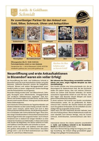 Schauen Sie auch im Internet unter:www.belmerschaufenster.de Belmer Schaufenster 5Wie lohnend eine %u00dcberpr%u00fcfung vermeintlich wertloser St%u00fccke sein kann, zeigen folgende Beispiele aus dem Gesch%u00e4ftsalltag:Eine Kundin brachte eine Schmuckschatulle mit, die sie %u00fcberwiegend f%u00fcr Modeschmuck hielt. Bei der Durchsicht stellte sich jedoch heraus, dass sich mehrere Schmuckst%u00fccke aus echtem Gold darunter befanden. F%u00fcr bereits aussortierte Gegenst%u00e4nde erhielt sie rund 700 Euro. Seitdem folgen viele Besucher diesem Beispiel und lassen ganze Schmuckk%u00e4stchen %u00fcberpr%u00fcfen.In einem weiteren Fall brachte eine Kundin verschiedene Schmuckst%u00fccke vorbei, die sie gr%u00f6%u00dftenteils f%u00fcr Modeschmuck hielt. Zwischen den St%u00fccken befand sich jedoch auch eine goldene Armbanduhr, f%u00fcr die schlie%u00dflich ein dreistelliger Betrag ausgezahlt werden konnte.Selbst wenn sich kein Edelmetall darunter befindet, kann sich eine Pr%u00fcfung lohnen. %u00c4lterer Modeschmuck erzielt mitunter ebenfalls noch kleinere Betr%u00e4ge, etwa bei Granatschmuck, Simili-Broschen, Gemmenschmuck oder Bernstein.Interessierte k%u00f6nnen ihre St%u00fccke weiterhin unverbindlichim Antik- und Goldhaus Schmidt in der Osnabr%u00fcckerStra%u00dfe 1 in Bissendorf pr%u00fcfen lassen.Nach einer Wertermittlung erfolgt bei Einigung eine sofortige Auszahlung. Der Ankauf erfolgt grunds%u00e4tzlich gegen Vorlage eines g%u00fcltigen Personalausweises. Ihr zuverl%u00e4ssiger Partner f%u00fcr den Ankauf vonGold, Silber, Schmuck, Uhren und Antiquit%u00e4tenAntik- & GoldhausSchmidtOsnabr%u00fccker Str. 1 | 49143 Bissendorf | 05402 4073756 info@antik-goldhaus.de | www.antik-goldhaus.deR%u00f6mergl%u00e4ser Bernsteinschmuck Modeschmuck Zinn Teppiche etc.Goldschmuck Silberbesteck Zahngold M%u00fcnzsammlungen Militaria%u00d6ff nungszeiten: Mo-Fr: 10:00-15:00 UhrParkm%u00f6glichkeiten: direkt vor dem Geb%u00e4ude Machen Sie Ihre Sch%u00e4tze jetztzu barem Geld!Die Neuer%u00f6ffnung des Antik- und Goldhauses Schmidt in Bissendorf sowie die erste Ankaufsaktion stie%u00dfen auf gro%u00dfeResonanz. Zahlreiche Besucher nutzten die Gelegenheit, Schmuck, M%u00fcnzen und andere Wertgegenst%u00e4nde unverbindlich pr%u00fcfen zu lassen. Aufgrund der starken Nachfrage wird die Ankaufsaktion nun fortgesetzt.Besonders h%u00e4ufig wurden Gold- und Silberschmuck, Zahngold, Bruchgold sowie Silberbestecke, Zinngegenst%u00e4nde und versilberte Tafelsilberwaren angeboten. Viele Kundinnen und Kunden zeigten sich %u00fcberrascht, welche Preise derzeit erzielt werden k%u00f6nnen. Hintergrund sind die aktuell hohen Edelmetallpreise.Auch klassische Schmuckst%u00fccke wie Teppicharmb%u00e4nder undGliederarmb%u00e4nder wurden zuletzt h%u00e4ufig verkauft. Viele Besucher waren erstaunt, welche Werte sich noch in alten Schmuckst%u00fccken befinden k%u00f6nnen, die oft jahrelang unbeachtet in Schubladen oder Schmuckk%u00e4stchen lagen. Hinzu kam, dass einige Scheideanstalten in Deutschland zeitweise ihrenAnkauf eingeschr%u00e4nkt oder ausgesetzt hatten. Auch im RaumOsnabr%u00fcck kam es dadurch bei einigen H%u00e4ndlern zu einer reduzierten Annahme von Edelmetallen. In dieser Zeit nutzten viele Kunden die M%u00f6glichkeit, ihre St%u00fccke weiterhin im Antikund Goldhaus Schmidt pr%u00fcfen und verkaufen zu lassen.Aktuell startet das Antik- und Goldhaus Schmidt zudem eine gr%u00f6%u00dfere Ankaufsaktion f%u00fcr Silberm%u00fcnzen. Besonders gefragt sind 5- und 10-D-Mark-Gedenkm%u00fcnzen aus Silber sowie 10- und 20-Euro-Silberm%u00fcnzen.BISSENDORFER BISSENDORFERSchauen Sie auch im Internet unter:www.bissendorfer-blickpunkt.deSchauen Sie auch im Internet unter:4 www.bissendorfer-blickpunkt.de 5bereits aussortierte Gegenst%u00e4nde erhielt sie rund 700 Euro. Doch auch ohne Edelmetall lohnt sich eine Pr%u00fcfung: %u00c4lterer Modeschmuck erzielt nicht selten noch 50 bis 100 Euro, etwa Granatschmuck, Simili-Broschen, Gemmenschmuck oder Bernstein. Empfohlen wird daher, im Zweifel einfach das gesamte Schmuckk%u00e4stchen mitzubringen. Der Ankauf erfolgt transparent und unverbindlich. Nach einer Wertermittlung wird bei Einigung sofort bar ausgezahlt, der Verkauf erfolgt gegen Vorlage eines g%u00fcltigen Personalausweises. Bei gr%u00f6%u00dferen Mengen oder fehlender Mobilit%u00e4t werden kostenlose Hausbesuche angeboten, ebenso die Begleitung von Erbnachl%u00e4ssen und Haushaltsaufl%u00f6sungen %u2013 h%u00e4ufig direkt vor Ort.Das Antik- und Goldhaus Schmidt befindet sich an der Osnabr%u00fccker Stra%u00dfe 1 in Bissendorf. Parkm%u00f6glichkeiten sind direkt vor dem Gesch%u00e4ft vorhanden, die Erreichbarkeit auch aus Osnabr%u00fcck ist unkompliziert. Ihr zuverl%u00e4ssiger Partner f%u00fcr den Ankauf von Gold, Silber, Schmuck, Uhren und Antiquit%u00e4tenAntik- & GoldhausSchmidtOsnabr%u00fccker Str. 1 | 49143 Bissendorf | 05402 4073756 info@antik-goldhaus.de | www.antik-goldhaus.deR%u00f6mergl%u00e4ser Bernsteinschmuck Modeschmuck Zinn Teppiche etc.Goldschmuck Silberbesteck Zahngold M%u00fcnzsammlungen Militaria%u00d6ffnungszeiten: Mo-Fr: 10:00-15:00 UhrParkm%u00f6glichkeiten: direkt vor dem Geb%u00e4ude Machen Sie Ihre Sch%u00e4tze jetzt zu barem Geld!Mit der Neuer%u00f6ffnung des Antik- und Goldhauses Schmidt hat Bissendorf eine neue Adresse f%u00fcr den Ankauf von Gold, Silber und Antiquit%u00e4ten erhalten. Zum Start l%u00e4dt das Fachgesch%u00e4ft zu einer gro%u00dfen Ankaufsaktion ein. Der Zeitpunkt ist g%u00fcnstig: Die aktuell hohen Edelmetallpreise erm%u00f6glichen attraktiveAngebote f%u00fcr den Verkauf von Goldschmuck, Silberschmuck, Zahngold, Bruchgold, M%u00fcnzen und M%u00fcnzsammlungen. Auch versilberte Bestecke und Alltagsgegenst%u00e4nde k%u00f6nnen noch einen realen Wert haben. Angekauft werden unter anderem versilberte Bestecke ab 90er Auflage, Zinngegenst%u00e4nde sowie sogenanntes Hotelsilber, also ungestempelte, versilberte Tafelsilberwaren. Diese Materialien werden kiloweise angekauft. Beispielha